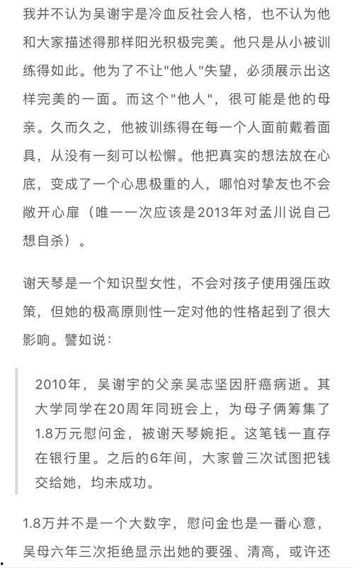 在吴谢宇的成长过程中,他展现出了惊人的才华。在这光鲜亮丽的背后,却隐藏着不为人知的阴影。据知情人士透露,吴谢宇从小就承受着巨大的压力,他的父母对他的期望极高,这让他倍感压力。在这样的环境下,吴谢宇的心理逐渐扭曲,最终走向了犯罪的道路。