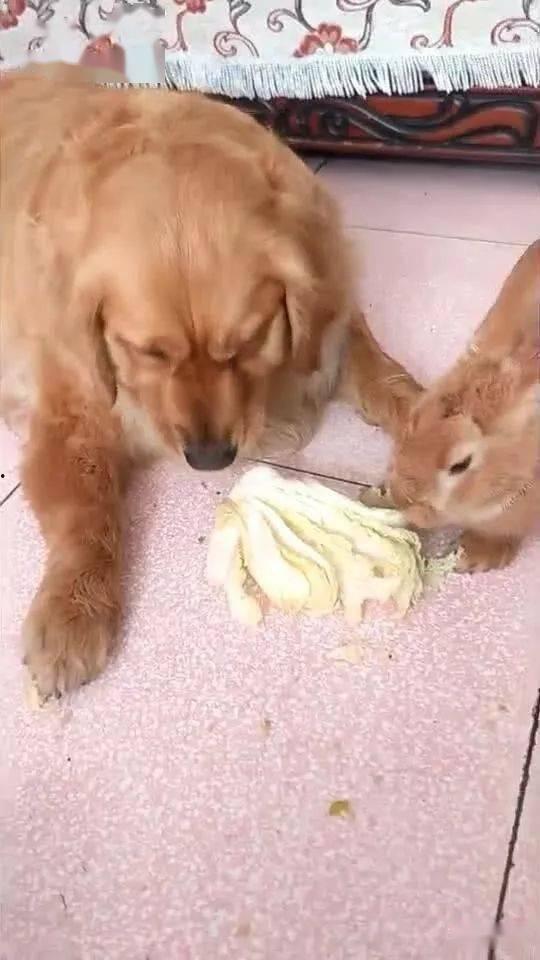 兔兔怎么可能轻易放弃呢?它瞪大了眼睛,小耳朵竖了起来,准备和狗狗展开一场“吃瓜大战”。